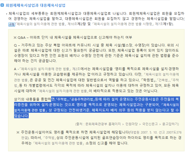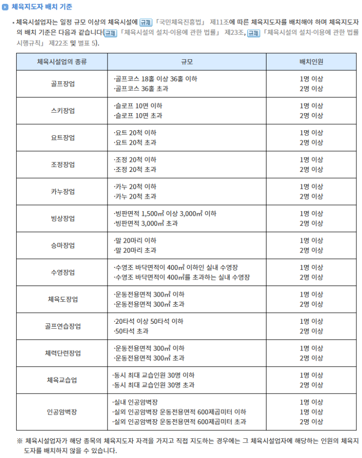 ★사설 헬스장, 골프장,수영장,체육관을 운영하는 입주민 = 스포츠지도사를 업장마다 1명씩 배치해야 한다!(ex: 헬스장1명, 골프장1명, 체육관1명, 수영장1명)